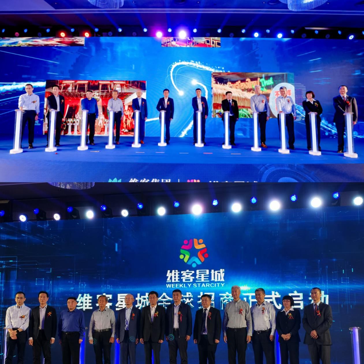 活动现场,李沧区副区长王永刚、维客集团董事长张贤存、青岛市商业联合会原会长孟广耀、青岛市商业联合会会长赵玉利以及其他部门领导共同为维客星城全球招商开启启动仪式。