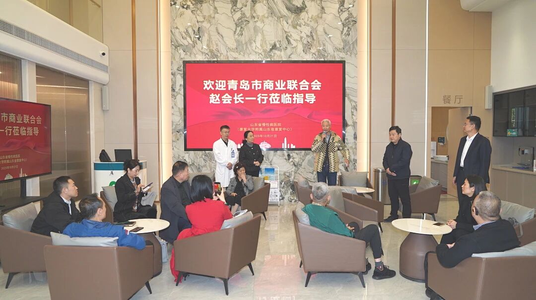 10 月 21 日,秋风送爽,硕果盈枝。青岛市商业联合会组织企业家访团,在会长赵玉利的带领下,走进坐落于青岛八大关风貌保护区的山东省慢性病医院(山东省康复中心)健康管理中心,开启一场以 “共探健康管理新模式,赋能企业员工健康” 为主题的参访交流活动。太平保险分公司党委书记总经理王京、灯塔味业董事长蔡可忠、总经理蔡小建、退役军人事务局就业创业部副部长王鹏、青岛金楷建设董事长王金生、广通食品董事长曲学涛、山东总裁商会主席李林、中远海通董事长仲建华、北大博雅商学院院长孟燕燕、青岛圣堃会展董事长谭英俊、康德玖业总经理冯素霞、青岛市守望非物质文化遗产研究院蒋景欣、青岛威海商会会长潘鑫元、青岛市团餐与酒店行业协会秘书长卢娟等嘉宾共同参与,携手搭建健康服务对接桥梁,共话大健康产业发展新机遇。